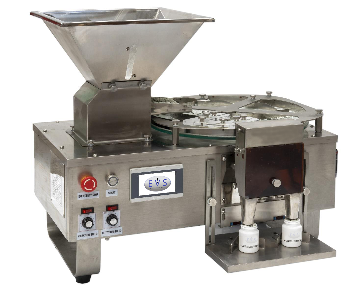 Máquina contadora de pastillas, píldoras, cápsulas y comprimidos. Pantalla táctil, Apertura de tolva, Botones de parada de emergencia, Sensor para detectar la presencia del tarro antes de iniciar el conteo y Regulador de velocidad de vibración y velocidad de rotación.